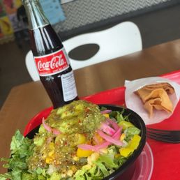 First time here, good quick salad spot. They have menu items but you can just go up and pick what you want which I like. Meal comes with chips. I wouldn't guess these are quality ingredients, olives tasted vinegary but it was a good fast meal. Price for chicken salad, added guac and bottle ice tea =$17.50. A little more than I was expecting. They have indoor and outdoor seating. Staff is friendly.